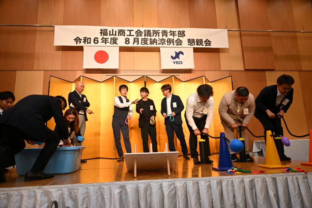 例会セレモニーでは、福山市市長公室の安原洋子世界バラ会議推進担当部長より、来年5月に開催される第20回世界バラ会議福山大会のPRが行われました。その後の懇親会は二部構成で行われ、第一部では委員会紹介とPR合戦を行い、結束力・盛り上がり・楽しさを競いました。第二部では3種類の縁日ゲーム(風船割り、輪投げ、スーパーボール掬い)を委員会で競い合い、暑い夏に負けず全力で楽しみました。