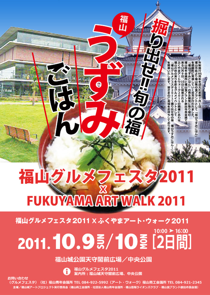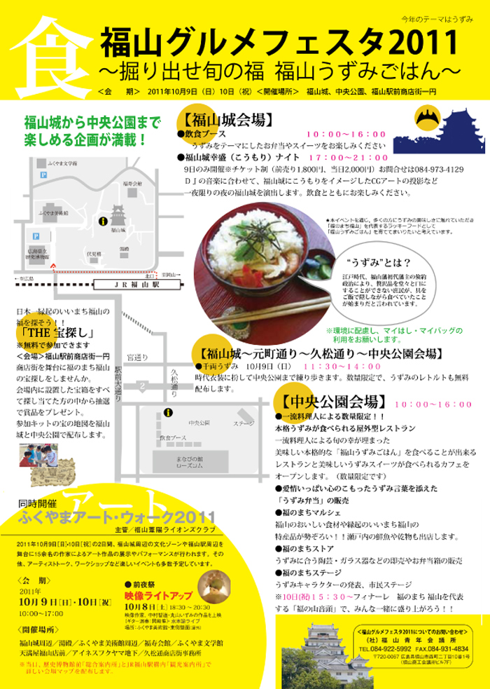 福山グルメフェスタ2011 PDFファイルをダウンロード(7M) 特別企画 千両うずみ(10月9日(日)11:30〜14:30開催) 特別企画 幸盛ナイト(10月9日(日)17:00〜21:00開催) ふくやまアート・ウォーク2011へ