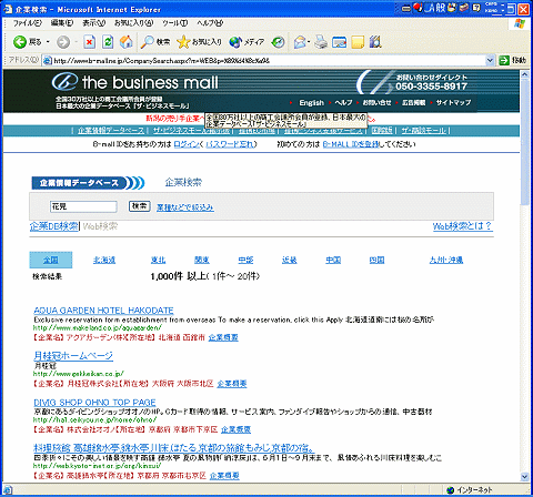 例えば、「花見」というキーワードでWeb検索をすると、1000件以上のページがヒットします。 企業ホームページを更新したら、その内容がビジネスモールのWeb検索にも反映されるということは、いつでも最新情報を公開できるということですね。普段どおりに自社のホームページを更新していれば、うっかりビジネスチャンスを逃がしてしまう心配がありません。 |
