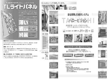 | @電光掲示板は、インターネットでの引き合いが95 %で、自社開発なので、ソフト開発・企画 から施工メンテナンスまで、全国対応のトータルサポート。 A TLライトパネルは住化アクリル販売鰍フ SA ライトガイドを採用し、蛍光灯と比べ、長寿命・超省エネ・超薄型・均一で高輝度と魅力たっぷ りの商品です。 |