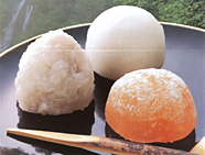 Together with the Eastern Hiroshima Prefecture Confectionary Commerce and Industry Society's Bingo Area Association for the Study of Confectionary Development, we work to create Fukuyama souvenirs (established name goods) that make use of local specialty items. Under the name "Fukuyama Sanpuku," "mefuku" (arrowhead plant mochi), "kafuku" (apricot mochi), and "senpuku" (Homeishu liquor steamed manjuu buns) have been sold since April 2000.