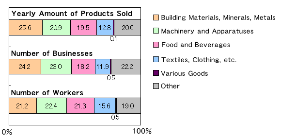 Although the number of businesses and workers are decreasing, the yearly amount of products sold is increasing and makes up 11.3% of Hiroshima Prefecture's total amount (8.7533 trillion yen).