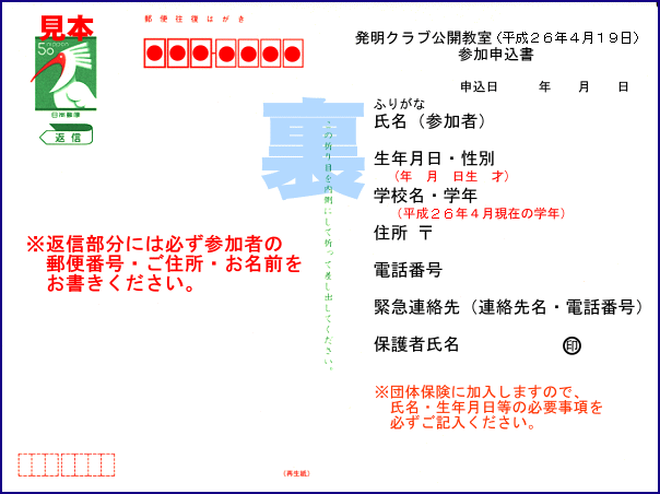【参加者のお名前・ふりがな・生年月日・性別・学校名・学年・郵便番号・住所・電話番号・緊急連絡先・保護者名(印)】