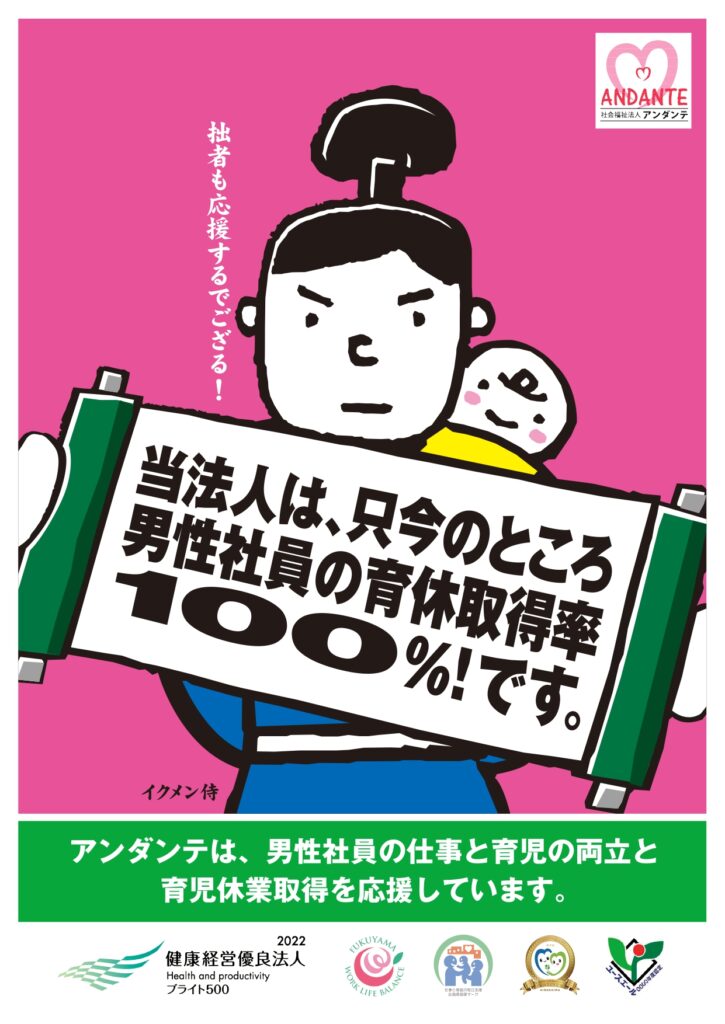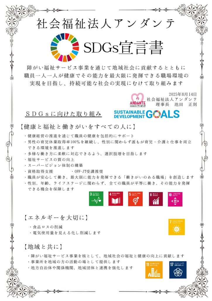 社会福祉法人アンダンテは、障がい福祉サービス事業を通じて地域社会に貢献するとともに、職員一人一人が健康でその能力を最大限に発揮できる職場環境の実現を目指し、持続可能な社会の実現に向けて8つのゴールに取り組みます。
