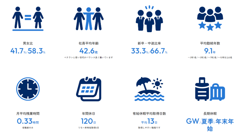 目標8「働きがいも経済成長も」 地域人材の積極採用と育成、地域学生の職場体験やインターンシップ等を積極的に受け入れ、地元経済の活性化に貢献しています。 ゼロ残業・有休取得の推進など、若手や女性も活躍できる働きやすく働きがいのある職場環境を整えています。