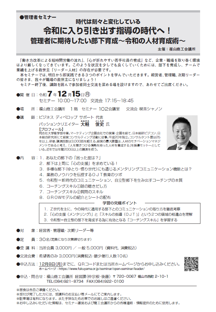「働き方改革による短時間労働の流れ」、「心が折れやすい若手社員の育成」など、企業・職場を取り巻く環境はより厳しくなってきています。このような状況を少しでも良くしていくためには、部下を育成し、チームで業績を上げる救世主『リーダー人材』の存在が必要です。                                  本セミナーでは、明日から即実践できる3つのポイントを学んでいただきます。                  またセミナー終了後、講師を囲んで参加者同士交流を深める場を設けますので、あわせてご出席ください。