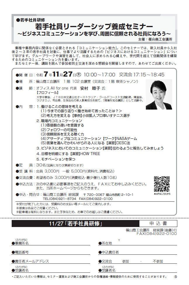 業種や業務内容に関係なく必要とされる「コミュニケーション能力」。このセミナーでは、新入社員から入社後2~3年の若手社員を対象に、仕事でより活躍するための「ビジネスにおけるコミュニケーション」について学びます。グループワークや演習を通して、社会人に求められる心構えや、世代間を超えて信頼関係を構築するためのコミュニケーション力を養います。 またセミナー後、講師を囲んで参加者同士交流を深める懇親会を開催予定ですので、合わせてご出席ください。