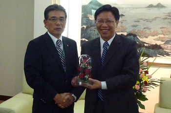 | 連雲港市政府表敬訪問(張序余副市長へ羽田福山市長よりばらのブリザードフラワーを贈呈) | 連雲港市政府表敬訪問(張序余副市長へ藤井副会頭よりミニ琴を贈呈) |