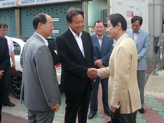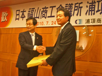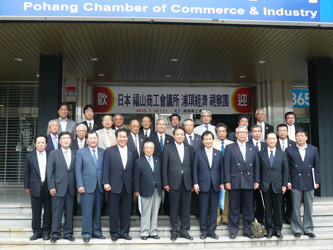 | 平成22年7月23日(金)から25日(土)の3日間、当所議員等による訪問団(林会頭団長、総勢21名)が韓国浦項市を訪ね、崔永祐(チェヨンウ)浦項(ポハン)商工会議所会長と懇談を行い、今後の経済活動について意見を交わし相互交流を誓い合った。 浦項市と福山市は1979年に友好提携の締結が行われ、以降、行政、各種団体、教育機関などを通じ、文化・芸術・スポーツ・観光などさまざまな分野で活発な交流が続いており、昨年は友好提携30周年を迎え、今後更なる国際親善と相互理解の輪が広がることが期待されている。今回の訪問は、長年にわたるこれら諸活動を基盤に、発展を続ける浦項市との経済交流の可能性を探り、今後の活動を推進するため、当所地域経済委員会と国際交流委員会の呼びかけにより実現したもの。 一行は、まずPOSCO製鉄所を視察、次に浦項商工会議所を訪問して商工奨励館を見学の後、懇談会に臨み、友好親善やビジネス交流等について話し合った。さらに朴(パク)浦項市長とも会談、歓迎レセプションに参加した。 また、当日は浦項国際花火大会の開催日にあたっており、市内から会場まで約2kmのパレードに参加し、多くの市民から暖かい歓迎を受けた。このイベントは今年で第7回を迎えており、市内を流れる兄山江(ヒョンサンガン)河口付近を舞台に、ミュージック花火ショーのような形式で、日本、カナダ、ポーランド、それに韓国の4カ国が競演し、約70万人(主催者発表)の人出があった。 なお、林会頭はこれら一連の行事に先立ち、一時離団して県内の他の商工会議所会頭とともに広島県などが進めるエアポートセールス活動に参加し、釜山(プサン)商工会議所並びにエアプサン本社を訪問、広島〜釜山便早期就航の要請も行った。 |