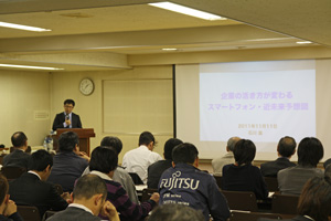 林会頭あいさつ後、スマートフォンの最新情報や、ソーシャル活用として、Twitter、facebookをどのように使いこなせばよいかについて解説した。また、ビジネスにおける活用事例をつぎのように紹介した。(一部抜粋)