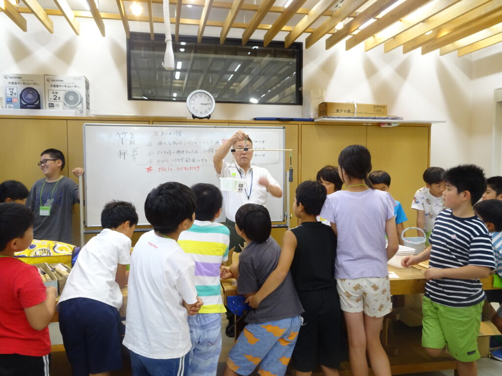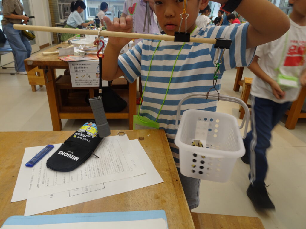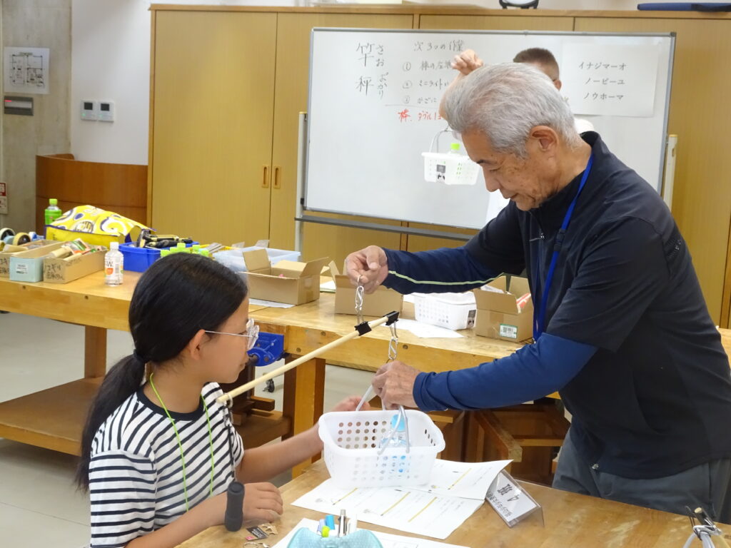 丸棒やおもり等を使用し、水平バランスをとることができる竿秤の製作を行い、計量の仕組みを学びました。