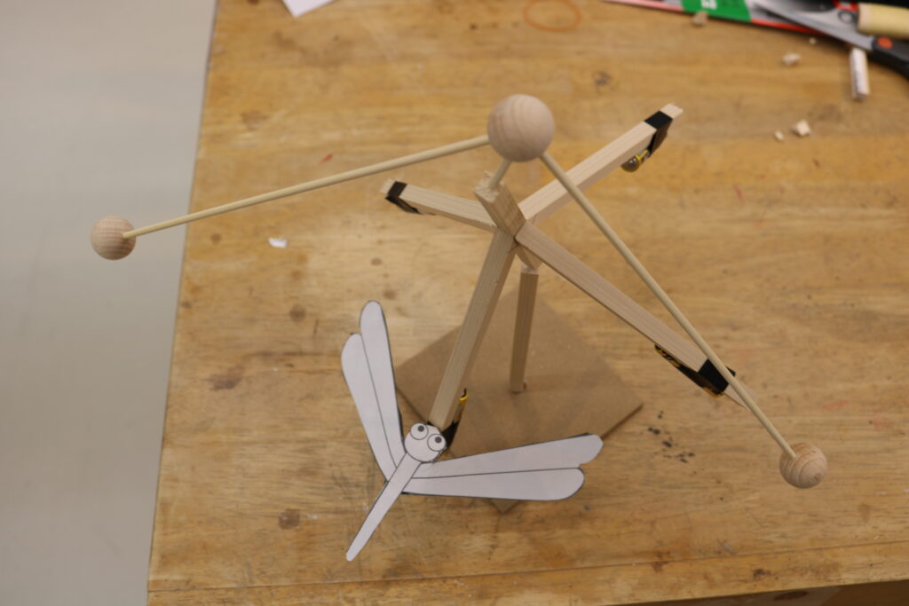 第1回例会では、てこの動きを利用し、トンボが動いて見える「やじろべえ」製作を行い、バランスをとるための、重心と支点の働きについて学びました。例会は、毎月第2・4土曜日、備後地域地場産業振興センターで開催します。