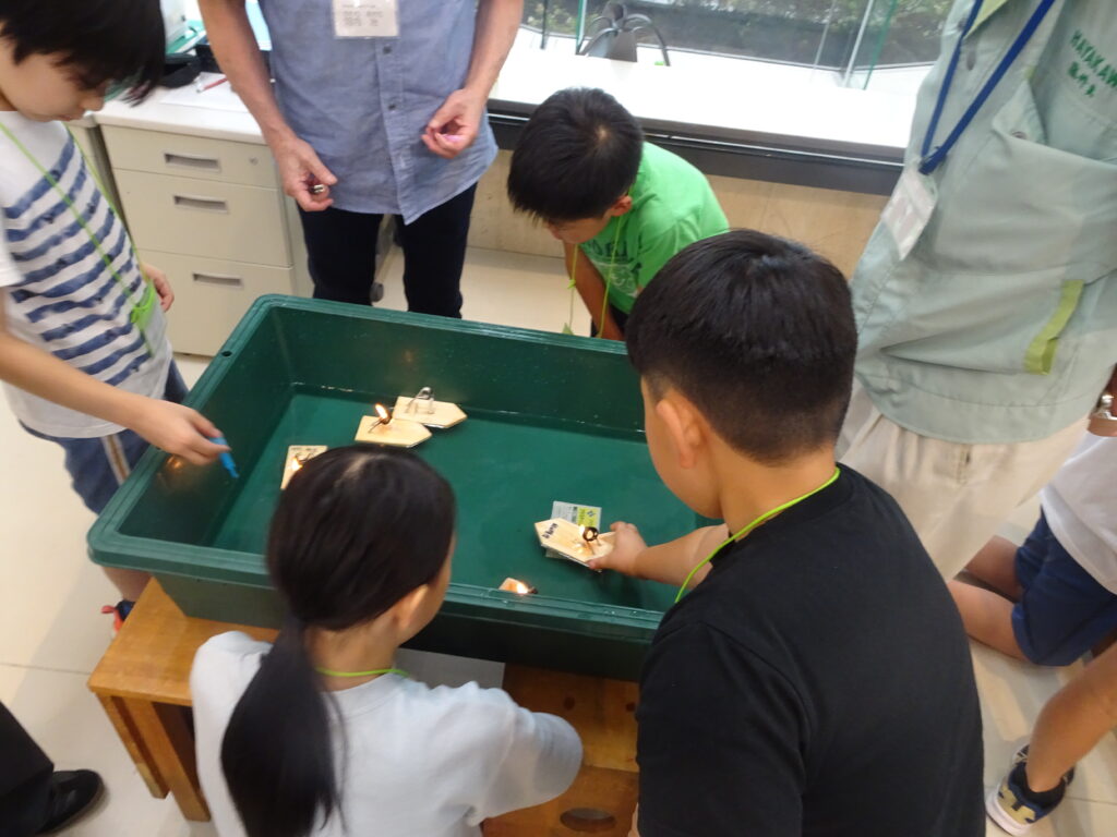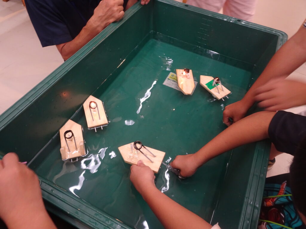自作した船を実際に水上で動かす実験を行いました。ロウソクの当て方やパイプの傾きによって、進むスピードや動きに変化が生まれることがわかり、試行錯誤しながら楽しく活動することができました。