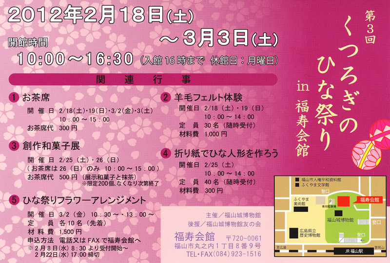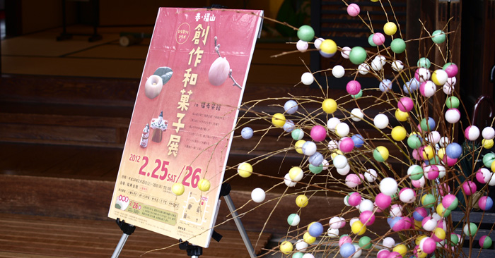 平成24年2月25日(土)・26日(日)の二日間、福寿会館で開かれている「第3回くつろぎのひな祭り」会場で「春・福山創作和菓子展」を開催し、二日間で685人の来場者で賑わいました。