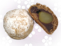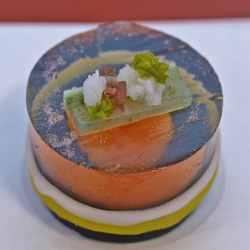 三色の菱餅に見立てた台座は桜風味を利かせ・抹茶ムース・クリームチーズベースの羊羹に目で見て楽しい練切菓子で花びらをあしらいました。みぞれ状にしたシャンパンゼリーの味がアクセントを与えます。 |